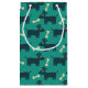 Un sac cadeau conçu avec un motif extensible avec un mignon chien souriant avec des oreilles disgracieuses et un os de chien. Arrière - plan vert.