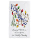 Illustration vintage dessin Joyeux Noël design avec le mot "Vacances" enveloppé de lumières de Noël colorées jaune, rouge et vert. Entouré d'étoiles dorées et d'un sapin de Noël de la forêt.