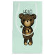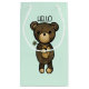 Un sac cadeau avec une simple illustration d'un ours brun caricaturé tenant une marguerite jaune. Bonjour écrit au-dessus de sa tête. Placé sur un arrière - plan vert pâle.