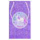 Ce sac cadeau est doté d'un design unicorne mignon avec arrière - plan parties scintillant faux violet. Personnalisez-le avec un nom.