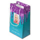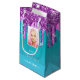 Un sac cadeau pour un anniversaire de 16, 16e anniversaire Sweet (ou tout âge) girly et glamour. Un turquoise dégradé de bleu avec des gouttes de parties scintillant en faux or violet et rose, la peinture goutte à goutte. Le texte : Le nom est écrit avec un script de style moderne en lettres blanches. Tempérer pour une date et l'âge 16. Personnalisez et ajoutez votre propre photo de la fille d'anniversaire. Peut être utilisé à la fois pour l'emballage cadeau ou comme un sac de faveur de partie.