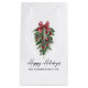Sac cadeau Fêtes avec ruban bow rouge burgundy, ornements de Noël, pommes de pin et baies de houx, verdure hivernale et pins aquarelle écriture calligraphique élégante moderne
