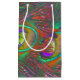 Ce magnifique sac cadeau comporte une photographie festive amusante de plumes de paon prises à l'aide de macro photographie. Des techniques de coloration artificielle ont été utilisées pour mettre l'accent sur les détails. Le résultat est un effet tinsel violet avec les oeillères montrant des nuances de rouge et de vert.