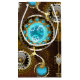 Turquoise lenses with antique watch with brass gears and golden keys on rusty, brown background. Steampunk style.