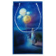 Design artistique Extraordinaire d'un ciel étoilé. Une petite fille aux pigtails dorés marche avec une vieille valise d'une main et des ballons brillants de l'autre. Chacun des ballons représente une planète distincte dans le système solaire. C'est une image montrant l'avenir de cette petite fille qui regarde vers l'avenir où elle va.