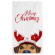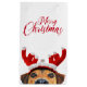 Illustration d'un animal de Noël mignon avec un chien curieux portant un bandeau de rennes. Salutation saisonnière écrite en lettres de typographie moderne.