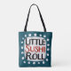 Un joli design typographique qui dit "Little Sushi Roll". C'est du texte en noir et rouge sur un rectangle blanc avec des points blancs amusants autour, le tout sur un arrière - plan turquoise.