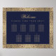Un plan de table élégant et vintage avec 7 tables, recommandé pour un mariage avec des couleurs de mariage bleu marine et or. Le fond est bleu marine. Il comporte des bordures florales dorées avec des décorations complexes de roses sauvages. Tout le texte est doré. Le mot Bienvenue dans la partie supérieure est écrit dans un élégant script calligraphique, le reste en majuscules.