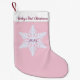 This holiday Christmas stocking is shown in a Baby's First Christmas 2025 snowflake print.