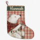 This customizable Christmas stocking features a classic cream-and-red plaid design with an antique gold border and a deep green cuff for name personalization.