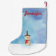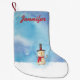 Un bas de Noël personnalisé avec une jolie illustration de bonhomme de neige. Il porte un casquette de fourche noir, tient une pipe à base de maïs classique et porte une écharpe rouge. Debout dans la neige blanche et froide, souriant et saluant. L'arrière - plan est composé d'un ciel d'aquarelle aux couleurs bleu et violet se mélangeant. Personnalisez avec un nom en rouge festif.