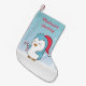 A cute stocking for the little ones to stuff the little christmas vendues. It has a cartoon of a cute and happy penguin holding on to a candy cane and wearing a Christmas cap. A beautiful snow background with pine trees. Put a smile on your little one's face with this delightful design. Le nom du personnel.
