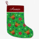 Add a cheerful touch to your holiday decor with this Cute Reindeer & Snowflake Christmas Stocking! Featuring an adorable reindeer face surrounded by snowflakes, stars, and poinsettias on a festive green background, this stocking is perfect for kids and adults alike. The back is solid red for a classic look, or you can choose to print the design on both sides. Personalize with a name or message, and customize the top and back colors to match your holiday style. Available in two sizes and three luxurious fabrics, this stocking makes a charming addition to your mantle. Pair it with the matching tree skirt, gift wrap, and gift bag for a coordinated Christmas look!