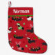 Dachshunds de Noël Se Stocking, Chiens mignons Dachshund dans les tenues de vacances de fête avec un Arrière - plan rouge avec un nom personnalisé.