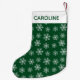 Un motif de flocons blancs sur un arrière - plan vert. Le haut du bas est blanc avec un nom personnalisé en vert assorti.
