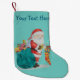 Ce stock original de noël a une photo du Père Noël avec son sac rempli de cadeaux tout emballé et prêt pour la livraison du jour de Noël, vous pouvez voir un peluche jaune avec un arc rouge et un lapin bleu qui sort du haut du sac vert. Le Père Noël tient un bas de noël rouge et or rayé coloré qui contient un bâton de bonbons et des petits cadeaux, il tient aussi un petit cadeau emballé dans sa main La jolie illustration est produite à partir d'un tableau original couleur de l'eau que j'ai créé il y a quelques années. L'image festive colorée et traditionnelle est superbe sur ce joli bas. Je pense que ce stock original de noël sera parfait pour la cheminée de Noël. Il s'agit d'un stockage personnalisable, vous pouvez le personnaliser avec votre propre texte.