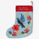 Large Christmas Stocking (Personalized) with Monogram and Wishes text - Merry Christmas and Happy New Year! XMAS Large Christmas Stocking decorated with Christmas blue bird magic symbols, Christmas red flowers ornaments, Winter Holiday gifts elements pattern floral BOHO Vintage pattern. Original Modern Stylish graphic design. Home, Home Décor, Christmas Décor, Stockings Gifts Presents Winter Holiday Decoration. Large Christmas Stocking Design with text template. Personalize them by adding name. Two sides graphic decoration.
