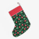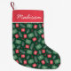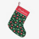 Ajoutez un accueil de vacances à votre maison avec de mignons bas de Noël personnalisés. Le stockage de vacances personnalisé présente votre nom dans un script blanc avec un arrière - plan rouge. Le design est composé d'un motif de motifs de Noël rouges et verts avec des baies sèches et des bouges de pin contre un arrière - plan vert foncé.