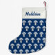 This cute Christmas stocking features a tiled mushroom pattern in blue floral Chinoiserie on a dark Navy blue background. The top is trimmed in light blue, with your recipient's monogram name in a script font. Make sure to type the name you want in the Personalize section.