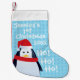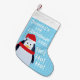 Blue snowflake pattern with happy cartoon snowman on personalized baby's first Christmas stocking. (for boy or girl)