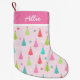 Make Christmas morning extra special with this personalized pastel Christmas stocking, featuring a cheerful pattern of pink, red, aqua, and lime green Christmas trees on a soft blush pink background. The top band can be customized with any name or phrase, making it a thoughtful and festive keepsake for kids or adults alike!