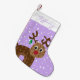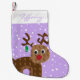 Petite réserve de Noël de rennes personnalisée. De mignons rennes de Noël au nez rouge et un ornement vert accroché à ses bois. Arrière - plan violet clair. Personnalisez avec leur nom dans une police joliment scriptée.