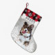 Ferme rustique arbres de Noël frais animaux de compagnie photo bas de Noël. Le stockage peut être customisé avec le nom de l'animal et la photo. Arrière - plan en damier rouge avec pins rustiques et flocons de neige. Le nom de l'animal est affiché sur un os de chien blanc. L'arrière de l'empoissonnerie est orné d'un plaid rouge et d'un motif de flocon blanc. Oeuvre de Moodthology Papery.