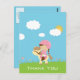 Cette fille merci carte postale a une jolie fille brune sur un cheval de caricature dans un champ de fleurs. Il y a des nuages bouffants blancs dans le ciel avec le soleil qui regarde derrière un seul nuage. Cela peut être facilement customisé avec votre message de remerciement à l'envers. Ceci fait partie d'un ensemble d'invitation d'anniversaire correspondant. Graphiques de Zenware Designs chez Mygrafico
