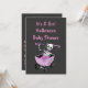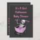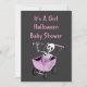 Une carte unique d'invitation de baby shower de Halloween qui offre un petit squelette de bébé se reposant dans un landau rose-clair, couvert par une couverture rose et secouant un os a formé le hochet squelettique comme image centrale sur la carte d'invitation. Le dos du c'est une fille que la carte de baby shower de Halloween vient avec de pleins détails de l'information de partie avec la même image squelettique de bébé adorable qui se repose à la droite des mots. Tous les mots peuvent être personnalisés avec vos propres détails de partie de baby shower de Halloween.