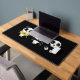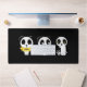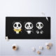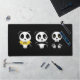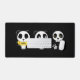 Deux petits pandas assis dans le noir avec un minuscule squelette. Un Panda porte un tee - shirt jaune avec le mot "meh" dessus.