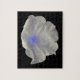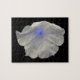 This awesome puzzle features a photograph of a petunia flower that has been manipulated to make the centre of the flower glow bright blue. The outer petals are white and the veins running out from the centre of the flower also glow blue. The flower is on a black background to make it stand out.