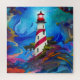 Beau phare rayé rouge et blanc sur une roche surélevée entourée de vents et d'eaux tourbillonnants colorés AI Art créé par minx267