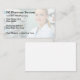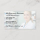 Simple Pharmacien thème pharmacie carte de visite conception personnalisée créée avec un arrière - plan graphique légèrement imprimé d'un pharmacien et divers produits pharmaceutiques dans l'arrière - plan.