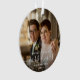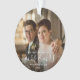 Commémorez le premier Noël de votre mariage avec ce magnifique ornement de gardiens moderne. Le texte blanc dit "Notre premier Noël en tant que Mme & Mme", avec les mots "Mme & Mme" dans un élégant script d'écriture manuscrite avec des fioritures avant et après. Remplacez l'exemple d'image par votre photo préférée, et ajoutez votre nom de famille et l'année. Un filtre dégradé foncé permet de faire apparaître le texte.
