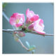 Une photo d'une branche d'un pommier avec des fleurs de pomme rose sur un arrière - plan bleu/gris.