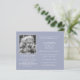 Nous sommes désolés de votre perte et souhaitons rendre le processus de commande de votre célébration des invitations à la vie aussi simple que possible. Ajoutez votre propre photo et remplissez les champs de modèle de texte des deux côtés. Si vous avez besoin d'aide, accédez au service GRATUIT LIVE DESIGNER de Zazzle via l'icône de votre page produit.