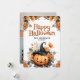 Photo Carte Halloween avec un collage photo, un jack o’lantern portant un casquette de sorcière noir et des fleurs orange sur le devant et un collage photo de trois photos à l’arrière. Personnalisez facilement cette carte photo Halloween avec vos photos et le nom de famille.