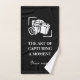 Photo de caméra citation noir et blanc personnalisé cadeau de serviette main. Design noir et blanc personnalisé avec citation inspirante et caméra dans le dessin de focus. Personnalisez avec votre propre slogan célèbre et votre photo en option. Idées cadeaux uniques pour photographes, collègues, collègue, patron, professionnel, amateur, éditeur, etc. L'art de capturer un moment.