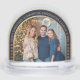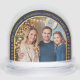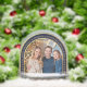 Il y a une photo de famille temporaire dans une arche, entourée d'une arche de couleur bleu marine avec des bordures dorées, avec du texte doré et des flocons de neige.