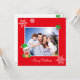 Belle famille et petit elfe mignon sur la carte de voeux de Noël rouge. Photo personnalisable.