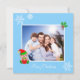 Photo de famille personnalisée et petit elfe mignon sur la carte de voeux de Noël bleu clair.