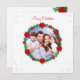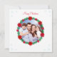 Jolie photo de famille personnalisée moderne, couronne de pin décorée de poinsettias et de flocons de neige Carte de voeux de Noël. Texte prêt à être personnalisé.