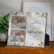 Plaque d'image de l'arrière-grand-mère verdoyante avec d'élégants feuilles d'eucalyptus vert d'aquarelle, accents floraux d'or, 2 photos à remplacer par les vôtres, le mignon dicton "l'arrière-grand-mère la plus aimée, merci d'être la nôtre", et les noms des petits-enfants.