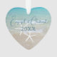 Des ornements de Noël pour les couples engagés. Décor arboré en forme de coeur avec thème de plage et deux étoiles de mer pour représenter le couple. Un côté a deux modèles de texte pour "Engagé à Noël" avec l'année ou la date. De l'autre côté, téléchargez une photo du couple et ajoutez des noms. Customisez tout le texte comme vous le souhaitez.
