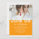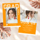 Photo Graduation Party Elégant Modern Script Invitations comprennent votre photo préférée avec le texte blanc simple "Grad (année)" et votre nom et les détails de graduation personnalisée sur le devant sur un arrière - plan orange profond. Au verso, ajoutez une image supplémentaire avec les informations sur l'invitation de graduation ci-dessous. Personnalisez en modifiant le texte dans les zones de texte fournies. Créé par ©Evco Studio www.zazzle.com/store/evcostudio