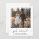 Cet établissement chic et économique propose une faire-part privée et une réception ouverte 24h/24. L'avant présente votre photo mariage dans un cadre carré découpé, "juste marié" dans un script élégant avec des swashes et vos prénoms et la date et l'emplacement du mariage dans la typographie moderne. Au contraire, vous pouvez personnaliser votre faire-part mariage, ajouter une invitation de réception ou de fête et signer vos noms dans un script signature.
