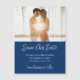 Un mariage Enregistrez la carte magnétique Date avec un arrière - plan bleu marine et des lettres blanches. Ajoutez votre photo, vos noms, date mariage et ville/état. Quatre champs peuvent être personnalisés pour en faire votre propre.