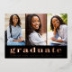 Une carte simple et moderne pour faire-part un diplôme. L'avant présente GRADUATE en typographie rose de feuille d'or. Personnalisez avec un collage de trois photos et le nom des diplômes, l'année de remise des diplômes et l'école. L'inverse a un modèle de typographie à personnaliser avec votre propre message ou vous pouvez supprimer tout le texte pour laisser vide.