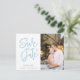 Cette simple et élégante carte Save the Date se démarque immédiatement du reste. Ajoutez la meilleure photo de votre couple, les noms et la date de la cérémonie de mariage à venir pour en faire la vôtre ! Vous pouvez modifier la couleur du texte bleu clair "Save our Date" pour mieux convenir à votre photographie, il vous suffit de cliquer sur "Edit using design tool". Vous pouvez également modifier l'adresse de retour au dos de la carte postale et ajouter votre message personnalisé. N'hésitez pas à apporter d'autres modifications au modèle en cliquant sur Modifier avec l'outil de conception.