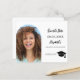 Une photo Enregistrer la carte de date pour une fête de remise de diplômes. Sur le devant : Ajoutez votre propre photo verticale du diplômé. Cadre d'arc photo. Un arrière - plan blanc chic, du texte noir. Modèles pour un nom et une date. Le nom et le texte : Save the Date sont écrits avec un script de style manuscrit moderne. Avec un casquette, garnir de bon goût. Retour : détails de la fête. 1 feuille = 1 Enregistrer la date d'impression arête à arête.